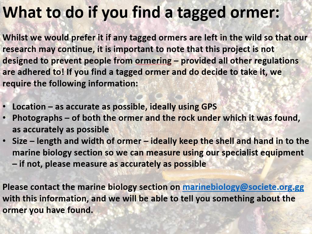 These photos show what a tagged ormer looks like, and what to do if you find a tagged ormer.
